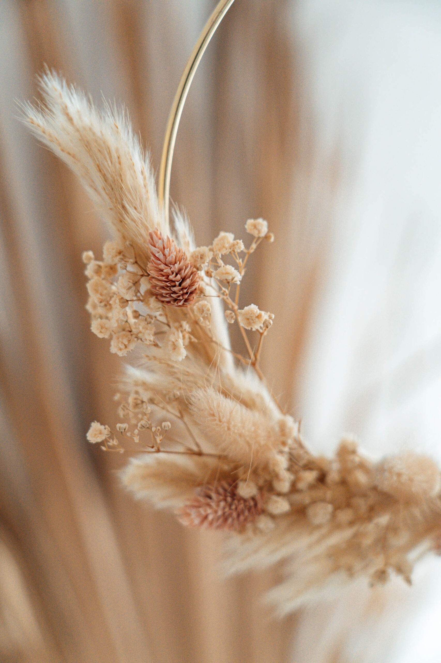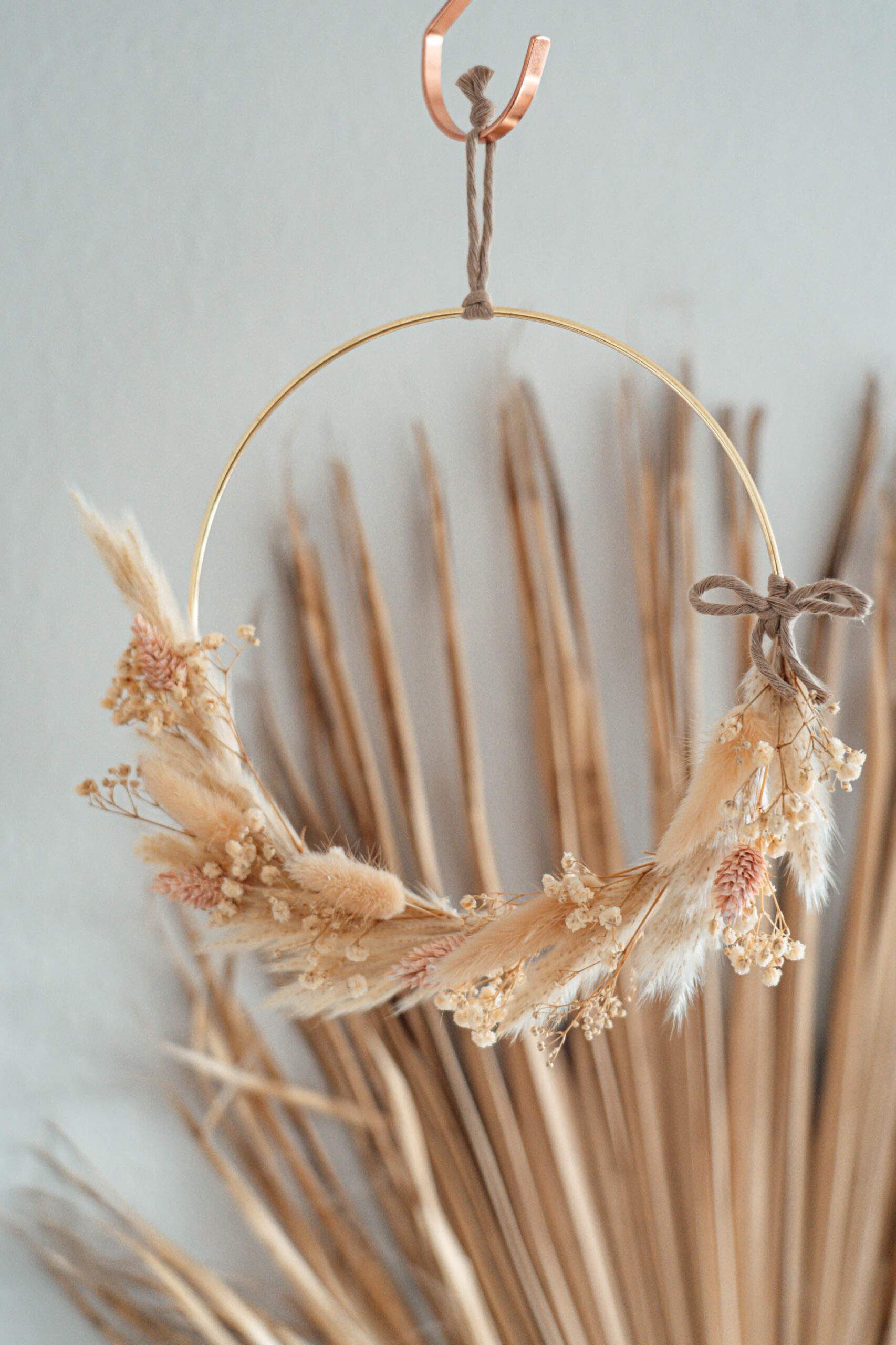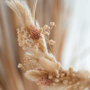 Für mehr Full-Circle-Momente in deinem Zuhause: Die kreisrunde Trockenblumenkranz Groot macht deine Dekoration komplett. Dafür werden verschiedene Blumen und Gräser mithilfe eines kaum sichtbaren Drahtes an einem Metallring befestigt. Entsprechend deiner Präferenz kannst du zwischen den Varianten hell, dunkel und natur wählen.